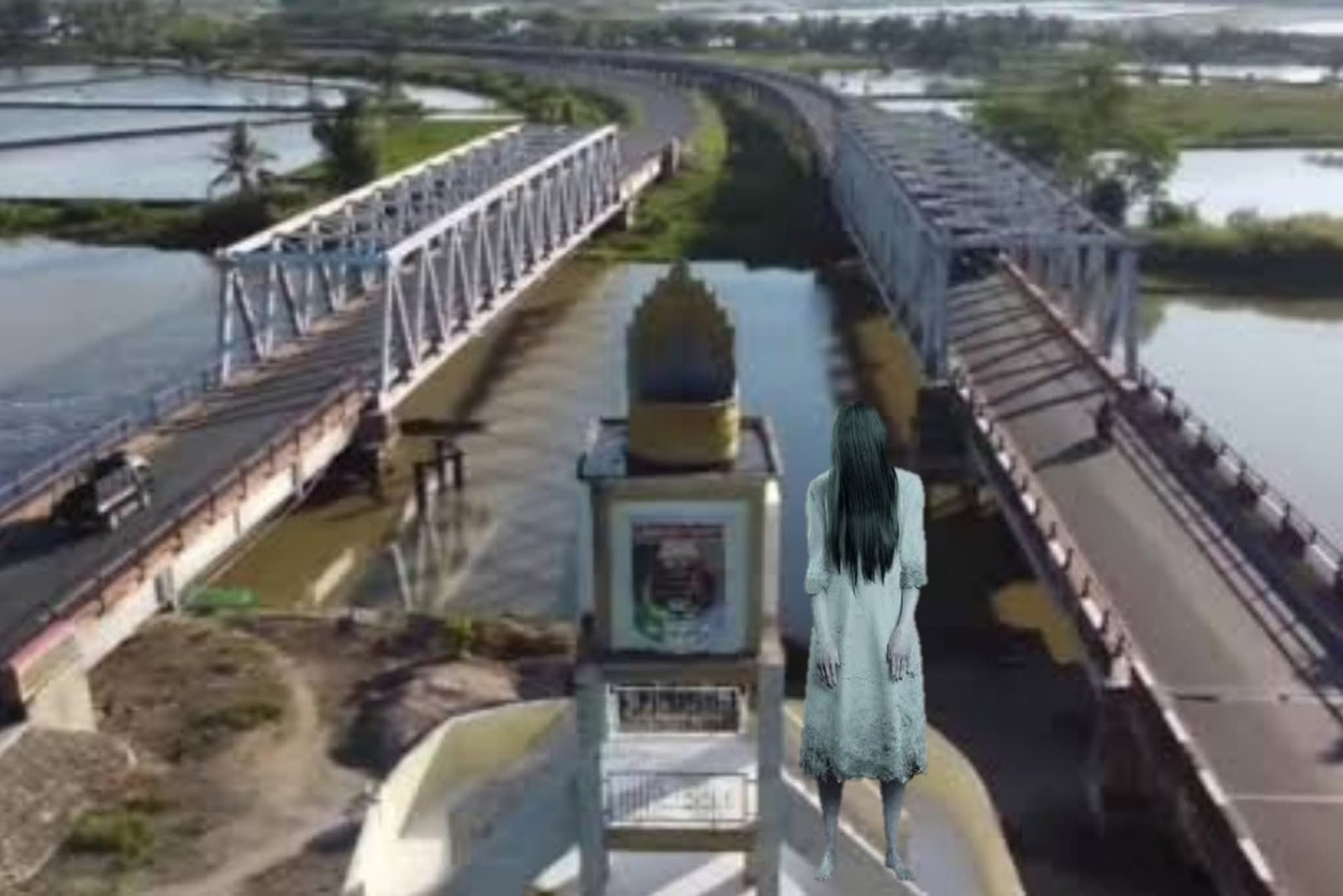 Selang beberapa menit kemudian, sebelum motornya melaju lebih dekat dengan ruas jembatan, dia dikejutkan dengan kemunculan seorang wanita berpakaian serba putih. Perempuan itu duduk persis di tengah-tengah palang jembatan.